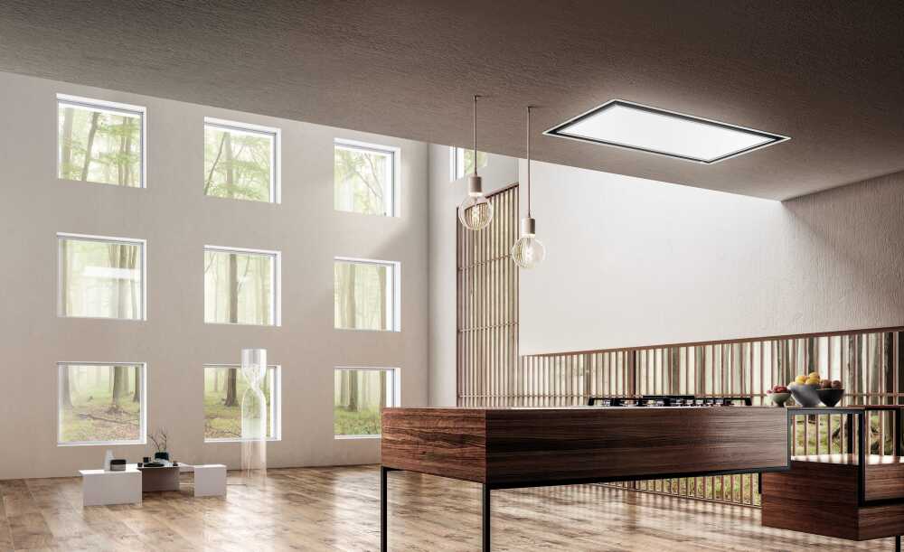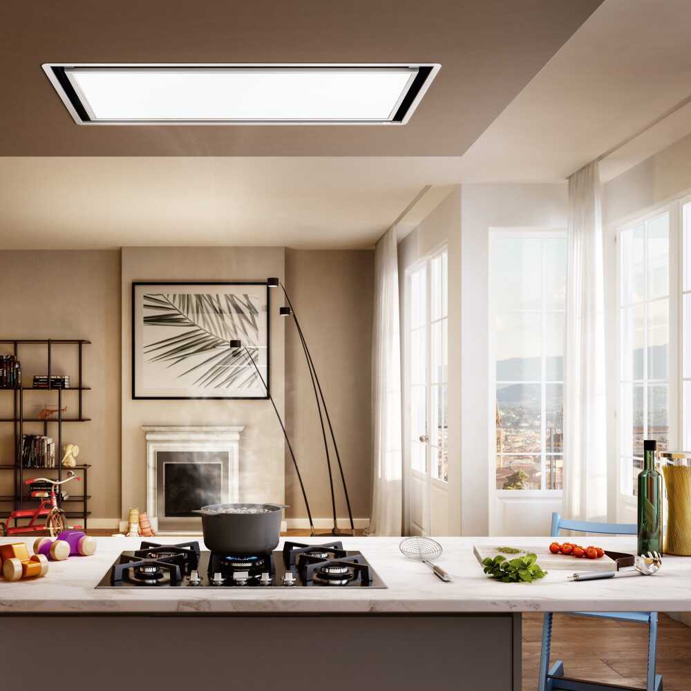 Mutfağa ışık getirmek için tasarlanmış bir tavan davlumbazı. Emme sistemi gizlenerek yerini ışık yoğunluğu ve tonu ayarlanabilen LED panele bırakır.