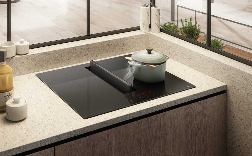 Kompakt boyut, üstün performans. Siyah cam ile öne çıkan sade ve kişilik sahibi tasarım, her mutfağın tarzına uyum sağlayarak güç ve yenilikçi fonksiyonlar garanti ediyor. Aspirasyon kapatıldığında tam bir lineer görünüme sahip olan cihaz olağanüstü bir estetiğe sahip. Kompakt boyutlarına rağmen, ocak üzerinde iki pişirme bölgesi birleştirilerek büyük ebatlı tava ve tencereler de kullanılabilir; kaydırmalı kumanda sistemi sayesinde tüm fonksiyonlar daima elinizin altındadır. Duman ve kokular, kullanımı ve bakımı basit, görünmez, sessiz aspirasyon sistemi tarafından otomatik olarak yakalanır. Uzun ömürlü koku önleyici filtreler kolayca çıkarılabilir ve dökülen sıvıları boşaltmaya olanak tanıyan özel bir valf eksiksiz hijyen sağlar.