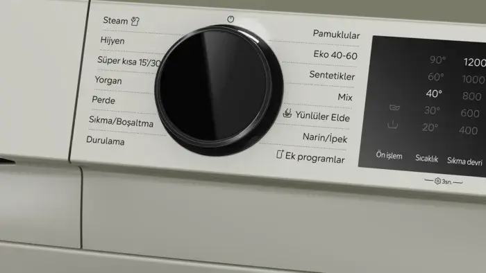 Hijyen, Steam, Perde, Sıkma-Boşaltma, Mix, Durulama, Yorgan, Süper kısa 15'/30', Kırışıklık önleme, Kalan süre erteleme, Başlat/Beklet tuşu, Sıcaklık seçimi, varioSpeed, Devir sayısı seçimi