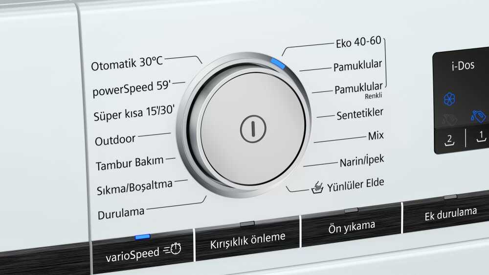 Aç/Kapat, Başlat/Beklet tuşu, Devir sayısı seçimi, Durulama, İlave Durulama, Kalan süre erteleme, Kırışıklık önleme, Mix, Otomatik hassas, Outdoor, Ön yıkama, Sıcaklık seçimi, Sıkma-Boşaltma, Süper kısa 15'/30', varioSpeed